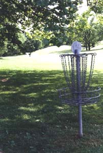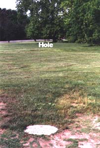 Hole #4 is a straight shot, but will also take a left to right. The creek runs down the right side of the fairway, and the 6th fairway runs down the left. Another huge sycamore tree forces the shots low as the Pole hole is under the tree. The creek lies about 20 feet to the right of the Pole Hole.
