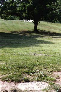 Hole #9.....When I designed this hole, the 2 large maples that stand right in front of the tee were not this large. There used to be a nice opening between the trees that you could throw through.....You notice that I said "used to be". The 2 large maples now provide a large wall that only tree surgeons can throw through. The Pole Hole lies about 30 feet above the tee with another maple protecting the right side of the fairway near the hole. A large drainage area runs perpendicular to the fairway and about 8 feet behind the Pole Hole. This drainage area is about 20 feet deep, so you don't want to go long. This is a tough hole, but once you learn its little secrets, it will usually let you par the hole.